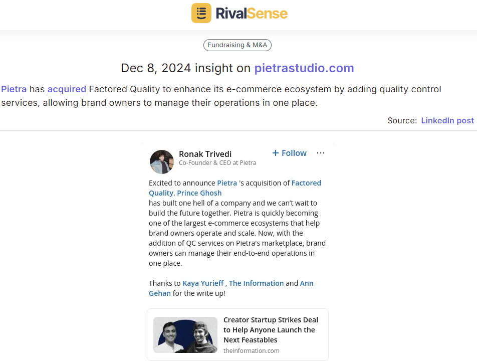 Prepare for changes in account dynamics triggered by company acquisitions. With RivalSense, you can analyze how this acquisition impacts their supply chain and pitch solutions to streamline their new operations.