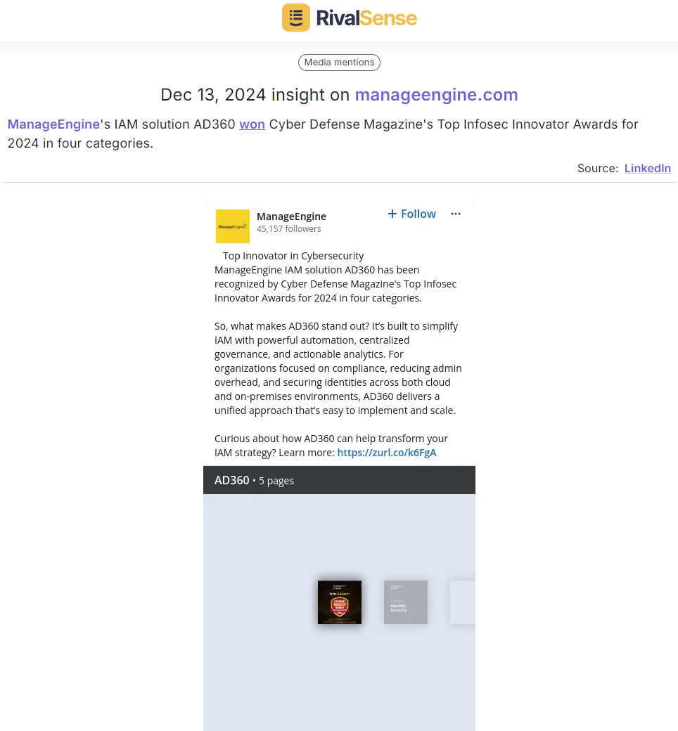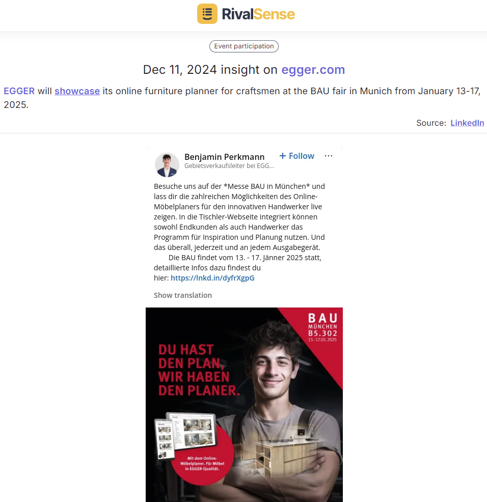 RivalSense provides details event participation, enabling you to connect with the client before or during the event with tailored insights and collaboration ideas. Additionally, by understanding their agenda and priorities at such events, you can position yourself as a supportive partner in their goals.