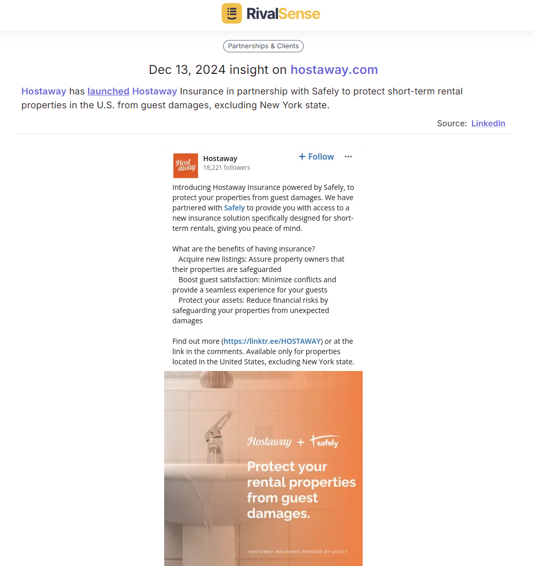 Identify moments where your services fit seamlessly. Product launches often represent critical periods for businesses, as they aim to capture market share, meet high customer expectations, and avoid potential operational bottlenecks. RivalSense allows you to track these launches in advance, enabling you to offer well-timed assistance, such as marketing strategies, technical integrations, or logistical support, that aligns with your client’s needs.