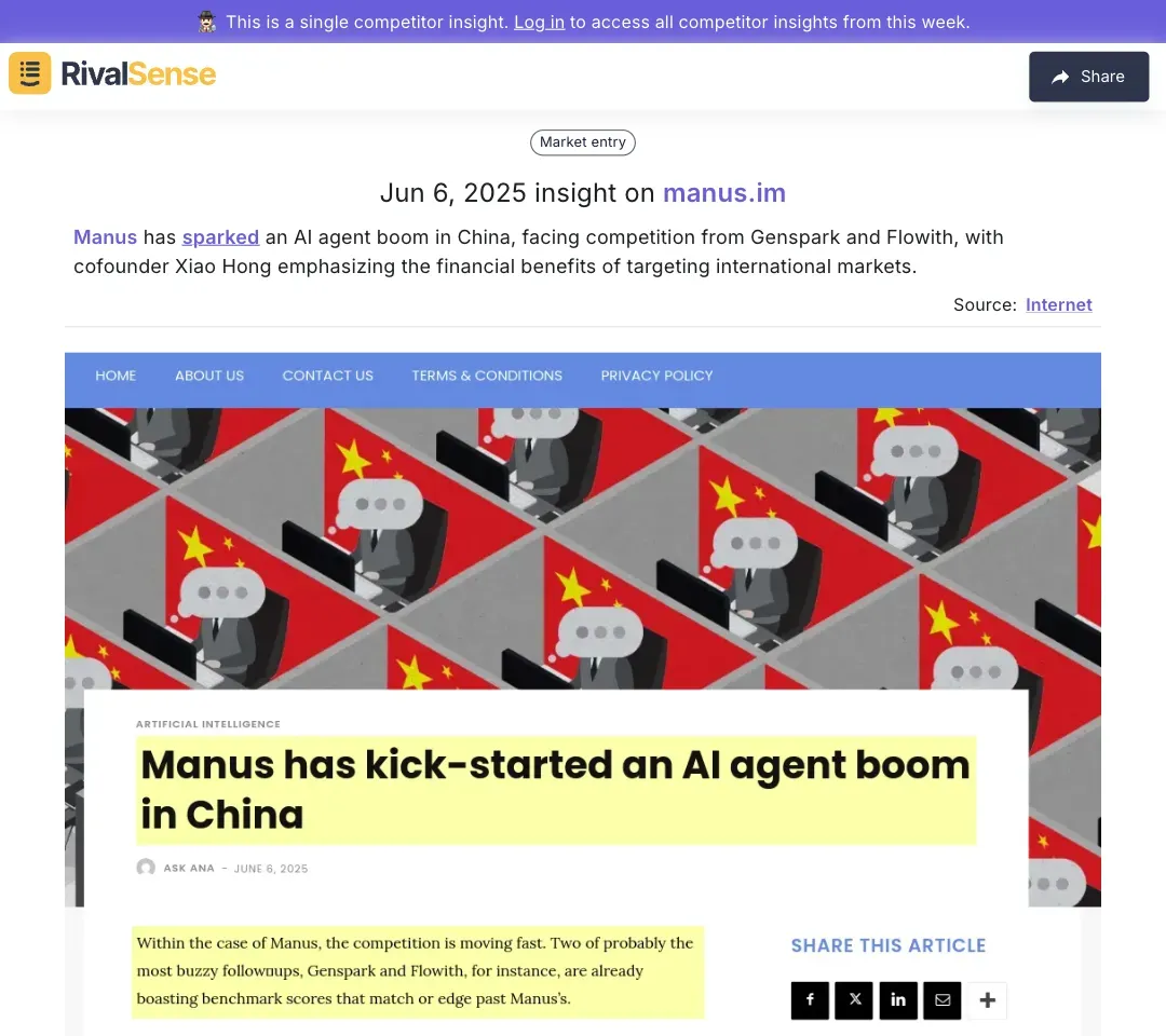 → Try RivalSense free to get your first competitor report today. Track product launches, pricing shifts, regulatory changes, and leadership moves—all delivered in actionable weekly insights.